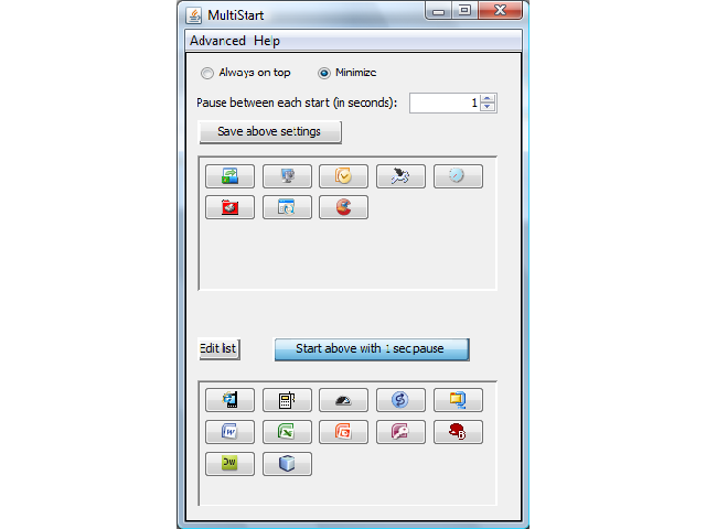Place the programs that you sometimes want to start with the PC and sometimes not, in a list. MultiStart will then start these programs with a single click – if you want to – or leave them unstarted if that’s what you prefer this time. MultiStart will help you edit the list and will show them as buttons on its form. You can click once to start many, or click one button at a time to start only the one associated with that button. If you want to, you can add parameters, so that for instance your net browser is started with a specific web page. You can specify an interval between each program start (actually this can be quicker).